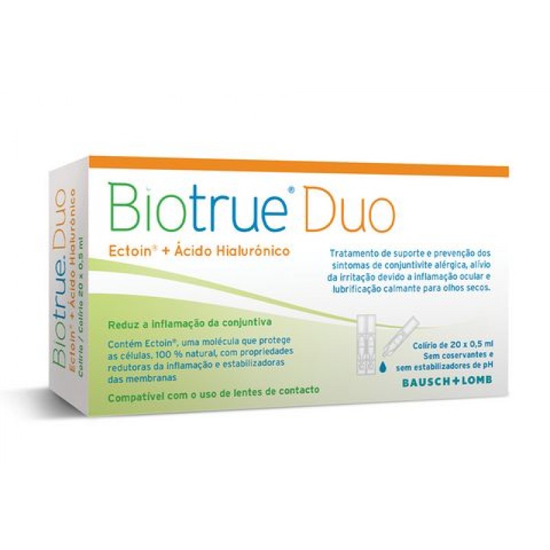 Biotrue® Duo estabiliza o filme lacrimal através da ação conjunta do ácido hialurónico e Ectoin®. Esta dupla ação protege o olho contra os efeitos nocivos dos alergénios e outros fatores externos, para além de contribuir no processo de regeneração da conjuntiva irritada e sensível.